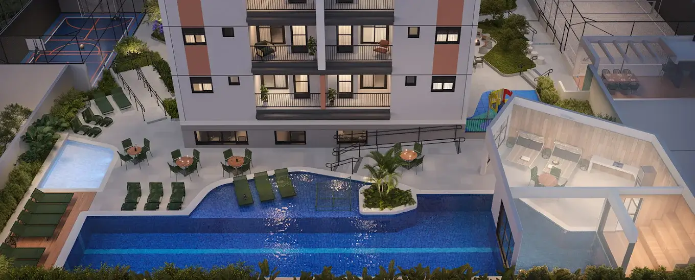 - Áreas Comuns: Piscina adulto, piscina infantil, deck molhado, bar na piscina, solarium, espaço grill, vip space, playground, quadra de areia, praça da fogueira, quadra poliesportiva, sauna, brinquedoteca, banho pet, espaço lutas, fitness, crossfit, salão gourmet, salão de festas, coworking, sala de jogos, delivery space, mini mercado, pet place.