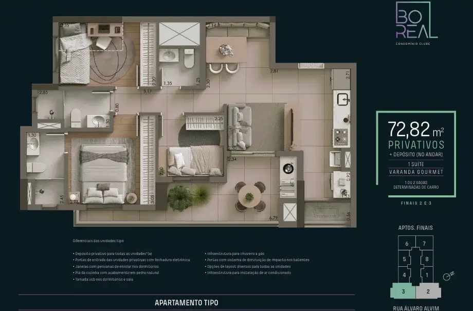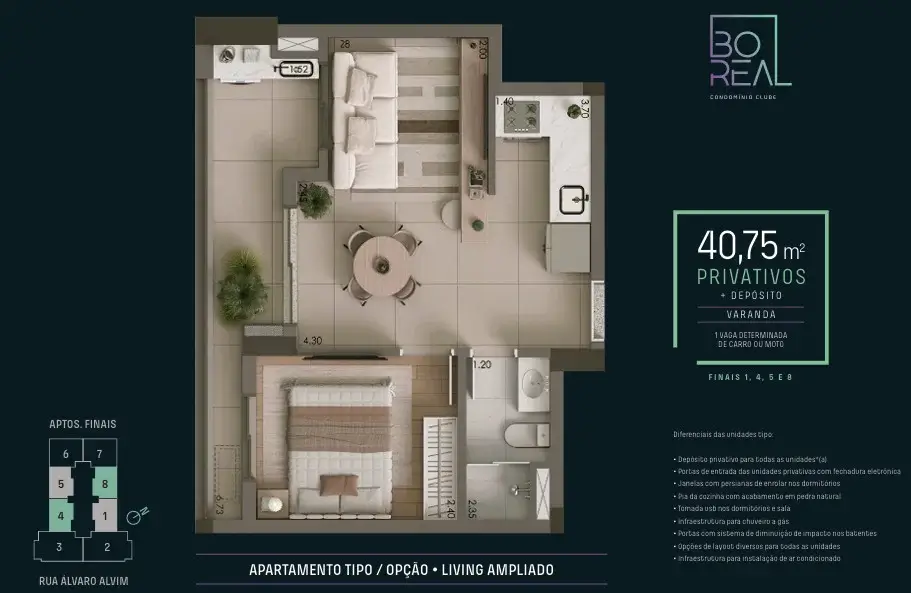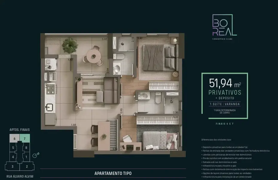 O projeto conta com ampla infraestrutura de lazer, incluindo piscinas, fitness, crossfit, salão gourmet, brinquedoteca, coworking, salão de festas e pet place, além de conveniências como mini mercado, delivery space e banho pet. Com localização estratégica na Rua Álvaro Alvim, o Boreal Condomínio Clube é ideal para quem busca morar bem em Osasco ou investir em um imóvel moderno e de alta liquidez.